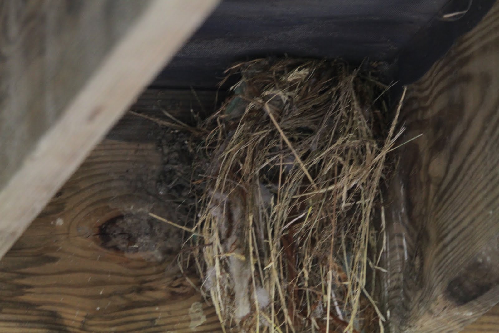 A male and female Purple Martin sit outside their apartment that is probably a lot neater than the swallow nest under our porch (middle shot below). That messy nest is less tidier than the house parents created a few years ago (bottom). It's the same nest they use each year, but probably not the same adults.